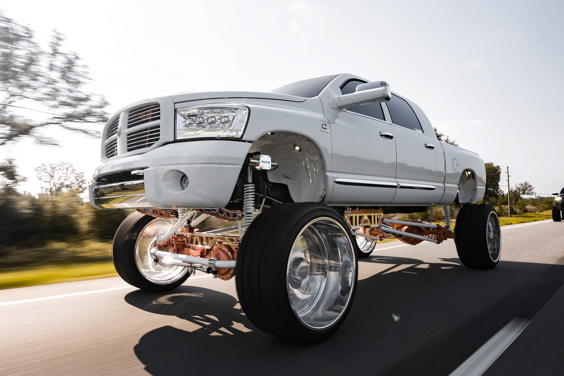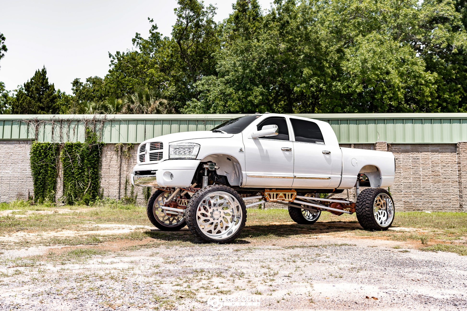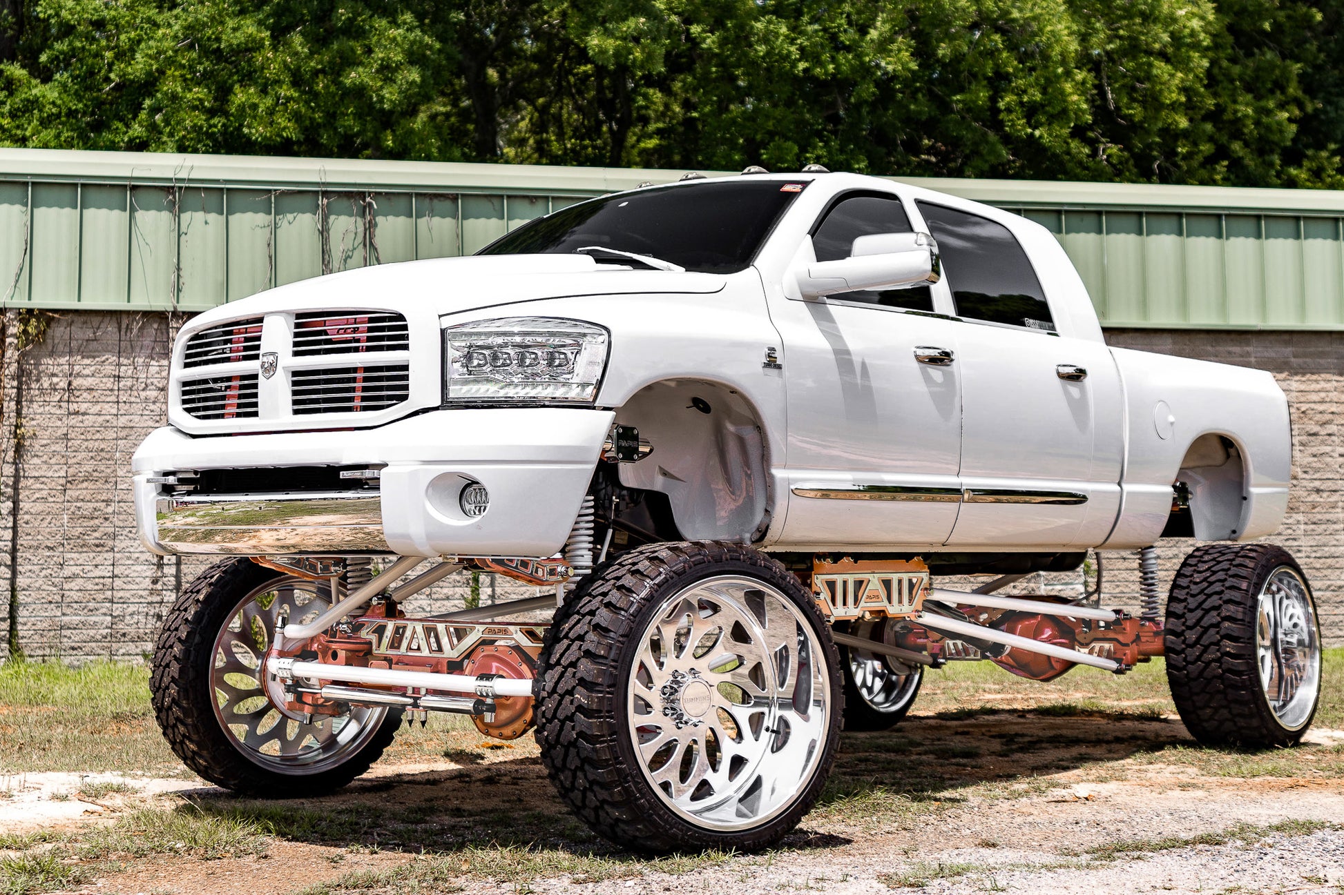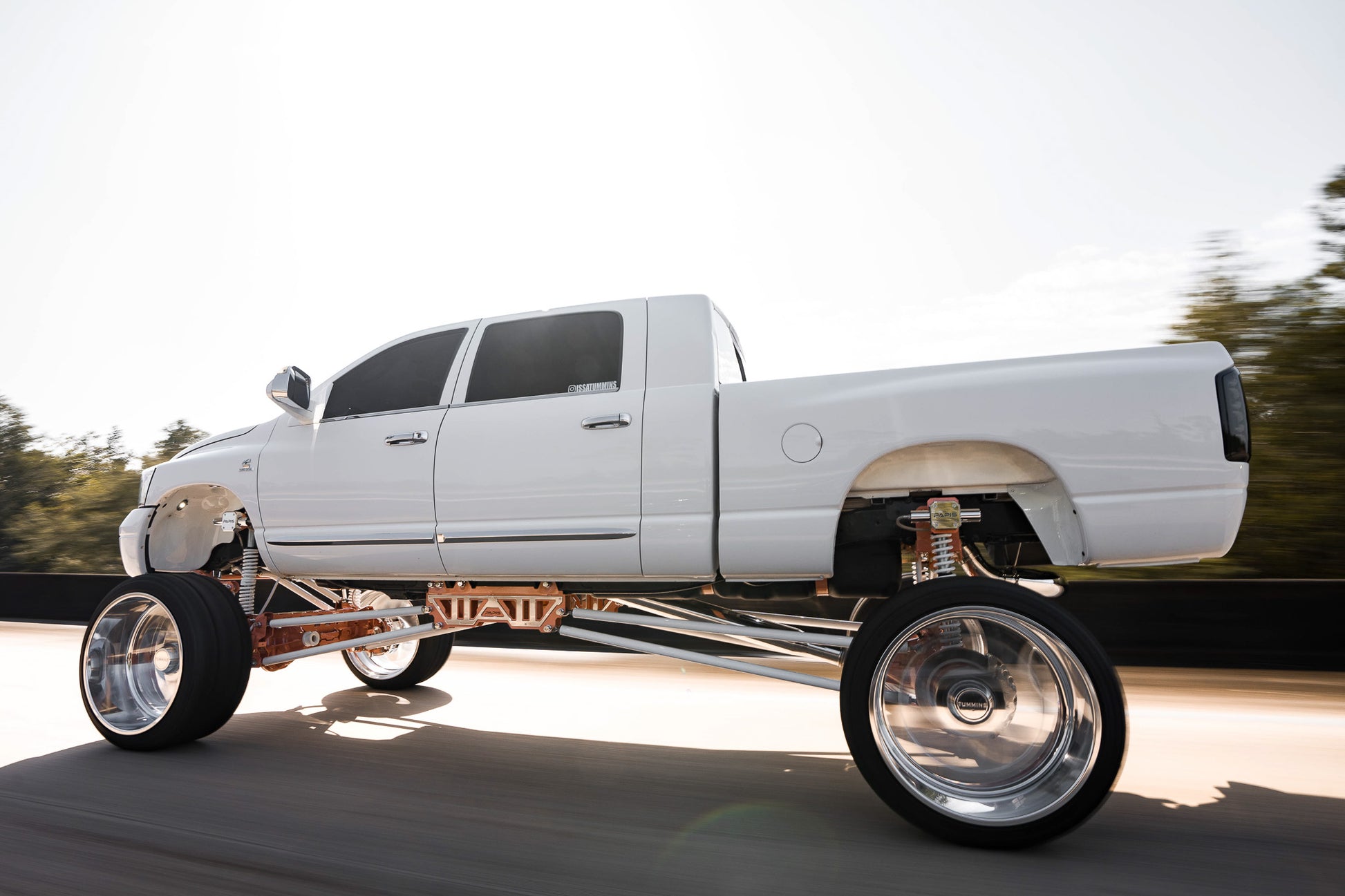 This 2006 Ram 2500 is on our Papis 10-18 inch Long Arm 4 link lift kit with rear 4 link and ccoil over conversion kit and a full High Steer Truss System. This truck is using a set of 16-18 inch Carbon Coil Overs and a rear 3 peice bracketry to run rear Coil Overs