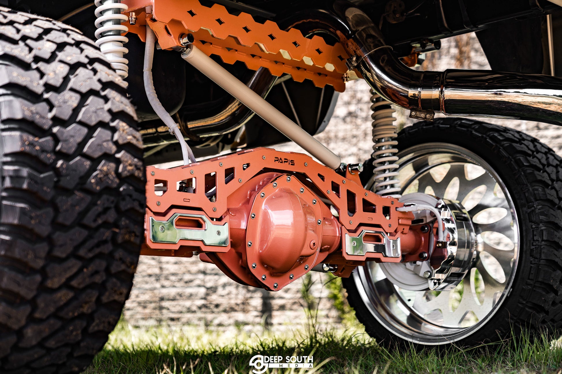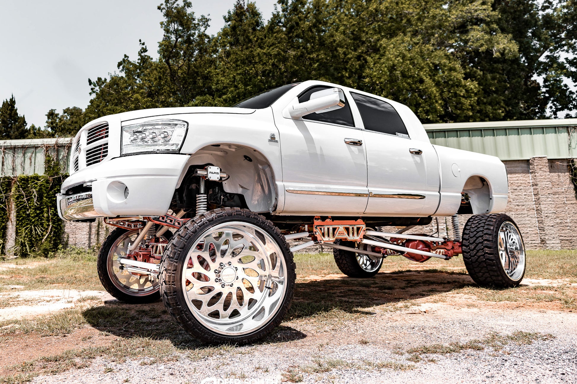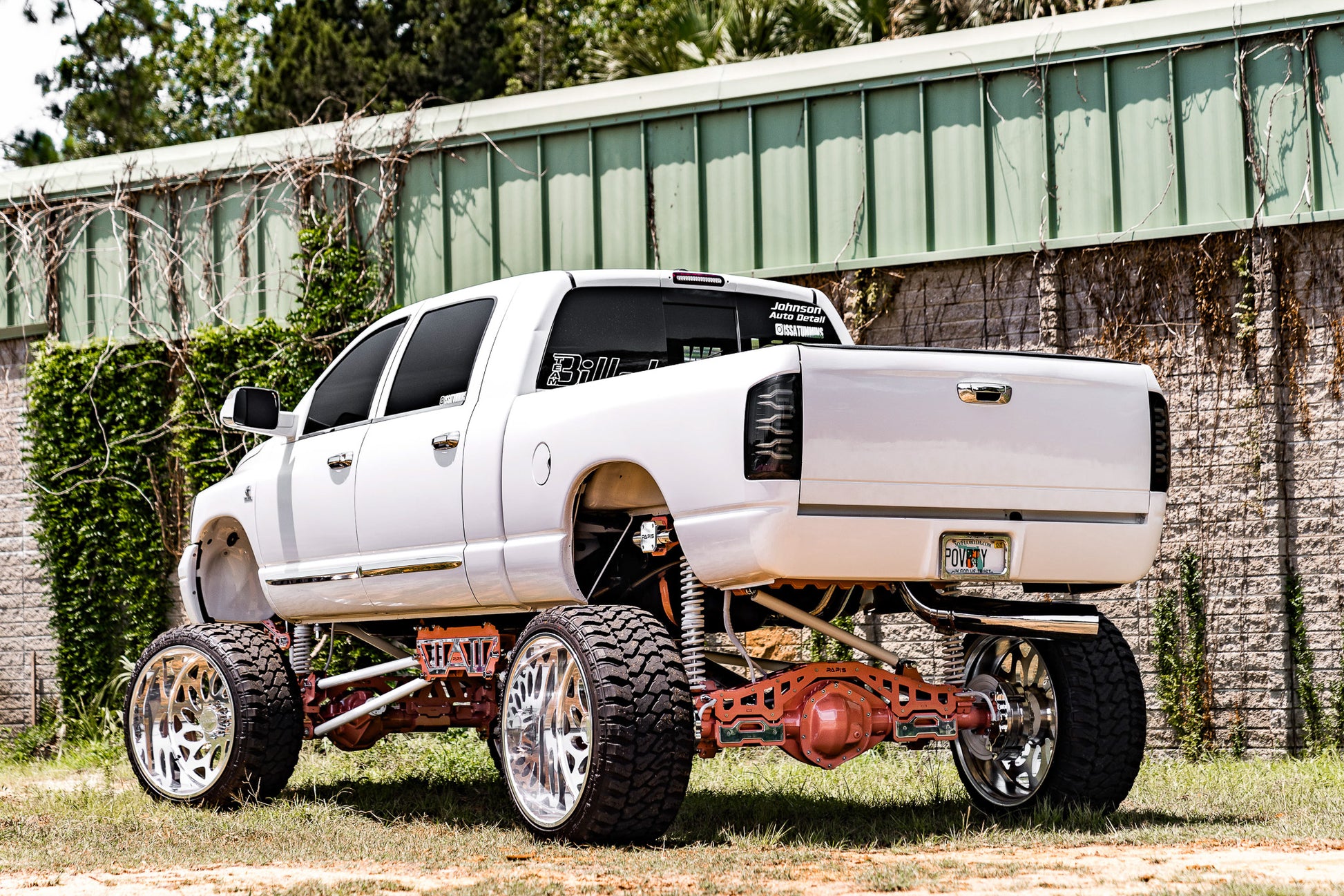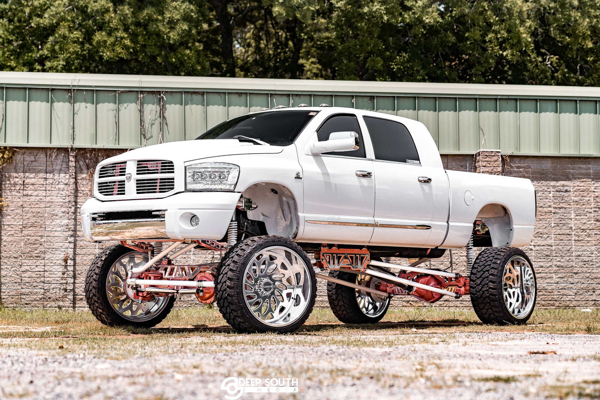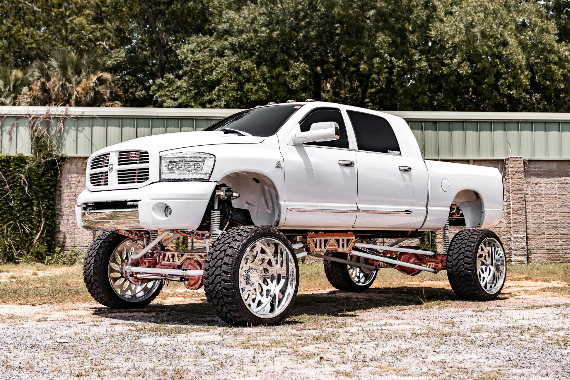 This 2006 Ram 2500 is on our Papis 10-18 inch Long Arm 4 link lift kit with rear 4 link and ccoil over conversion kit and a full High Steer Truss System. This truck is using a set of 16-18 inch Carbon Coil Overs and a rear 3 peice bracketry to run rear Coil Overs