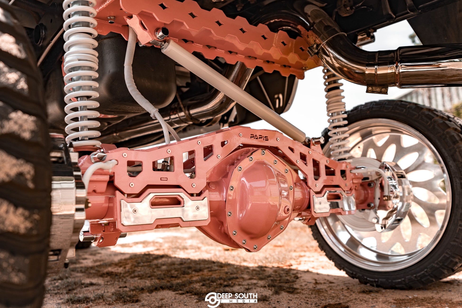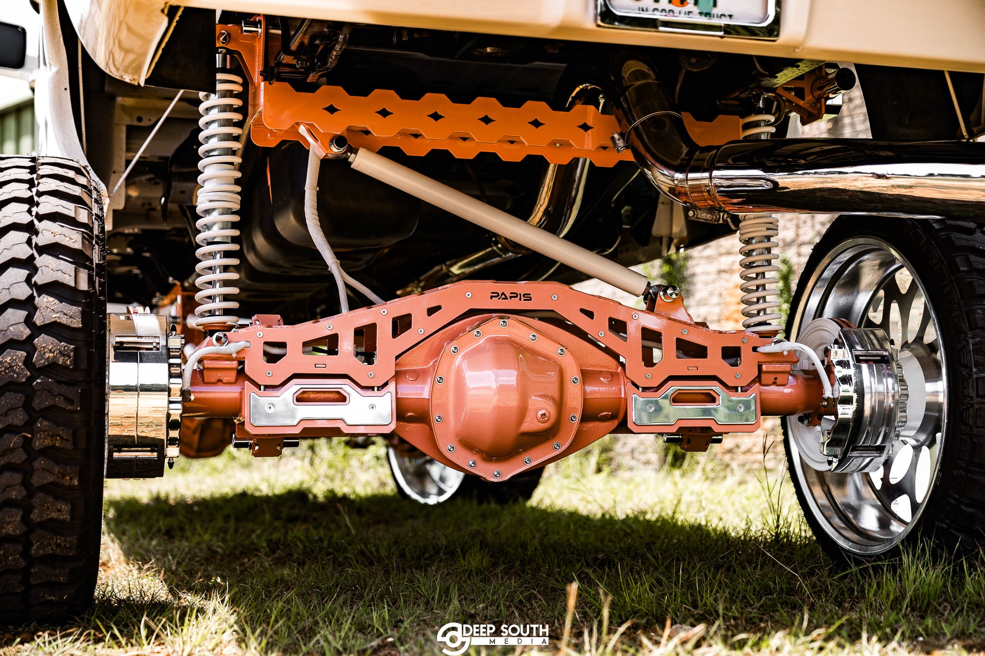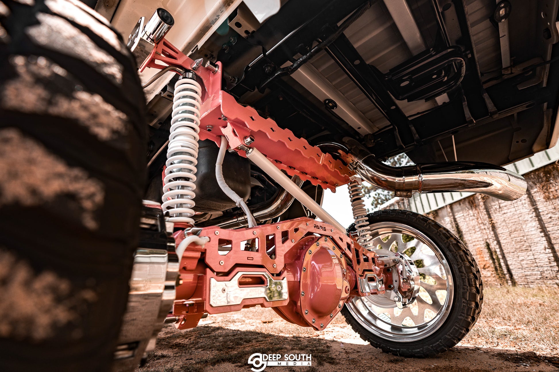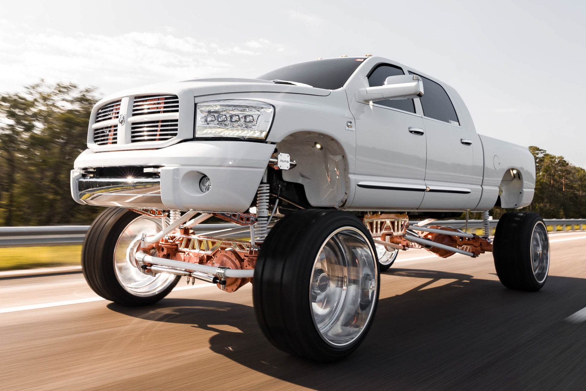 This 2006 Ram 2500 is on our Papis 10-18 inch Long Arm 4 link lift kit with rear 4 link and ccoil over conversion kit and a full High Steer Truss System. This truck is using a set of 16-18 inch Carbon Coil Overs and a rear 3 peice bracketry to run rear Coil Overs