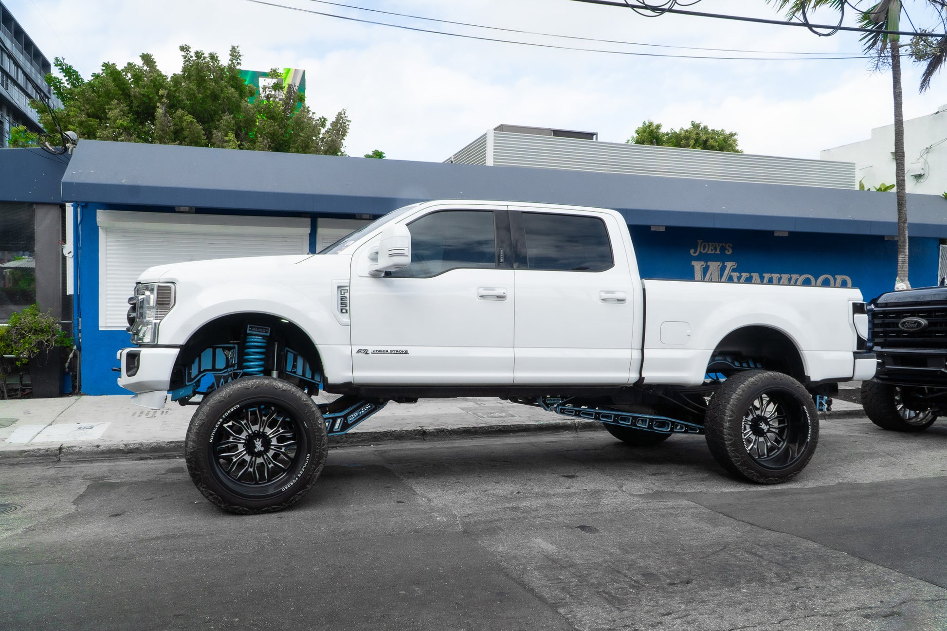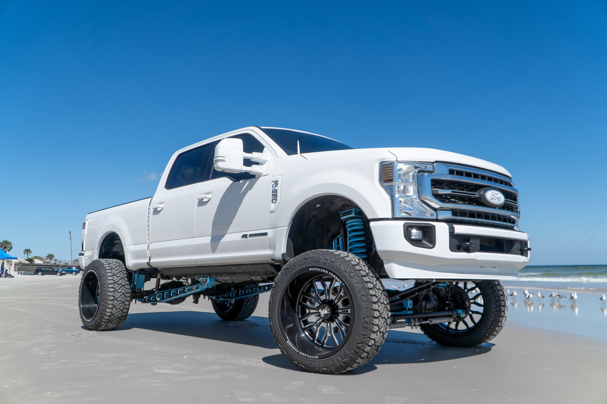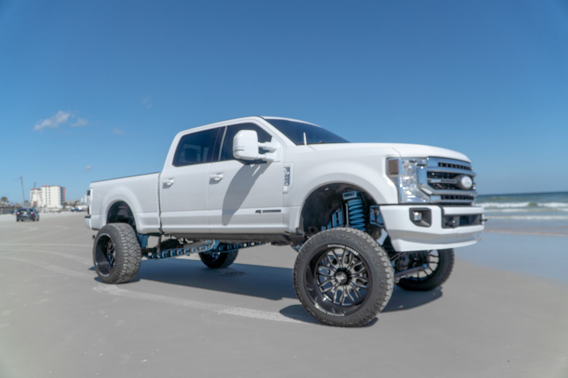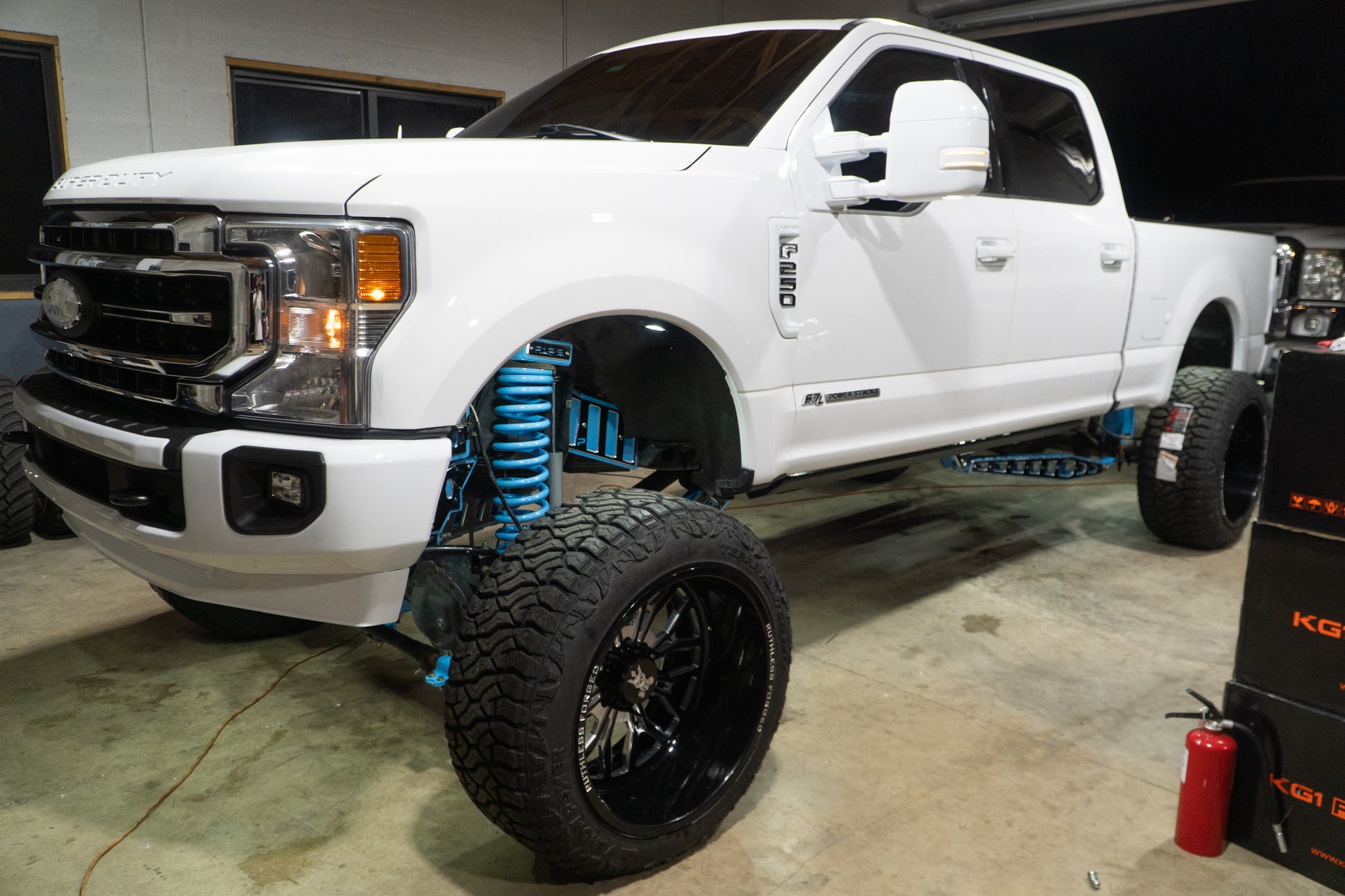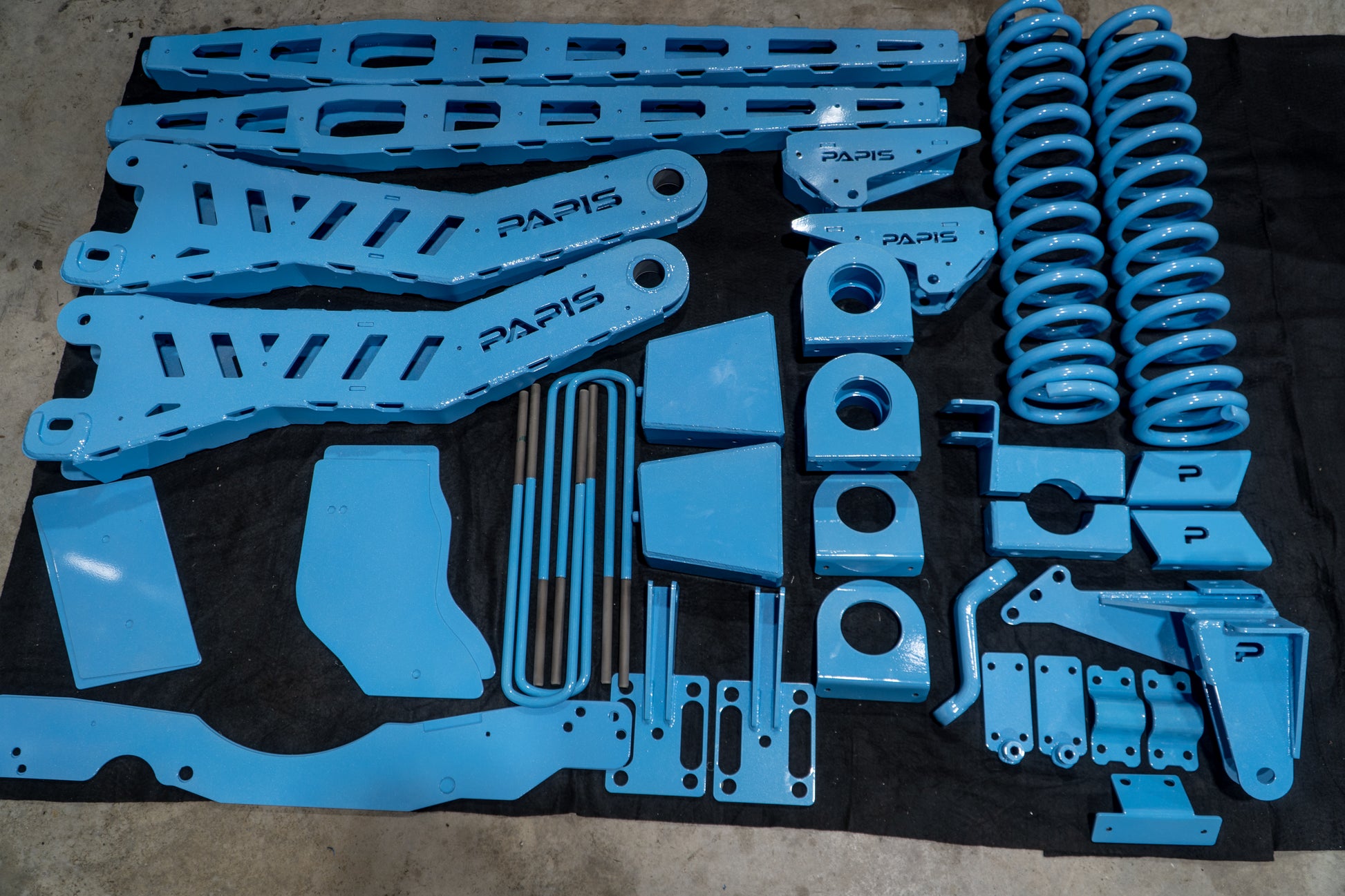 This 2017 F250 Super Duty is on our Papis 4.5-10 inch Papis Radius Arm lift kit with traction bars and a steering stabilizer bracket. This truck is using a set of 8 inch springs with our 2.5 level kit on top as well as a set of 10 inch blocks in the rear