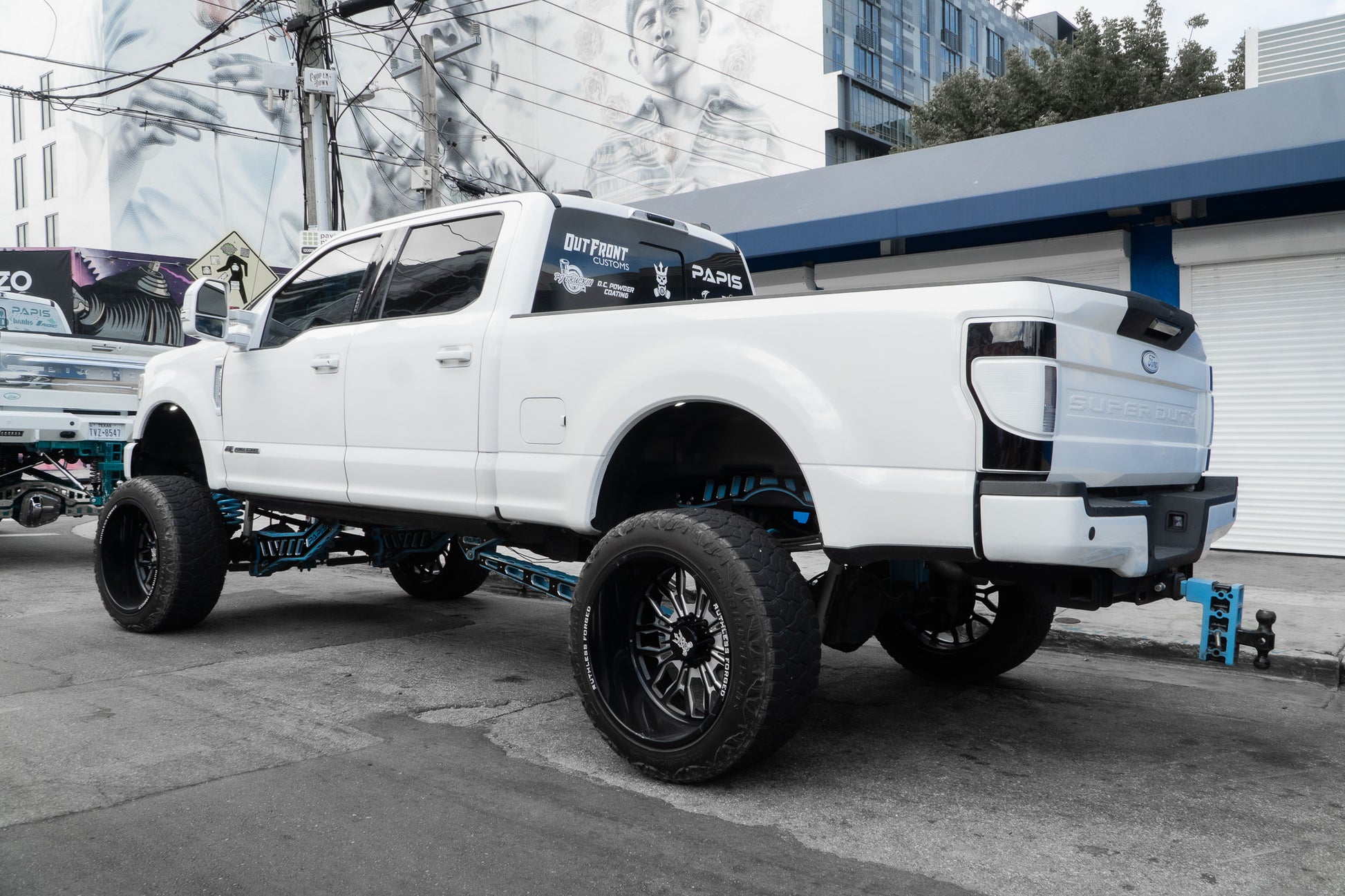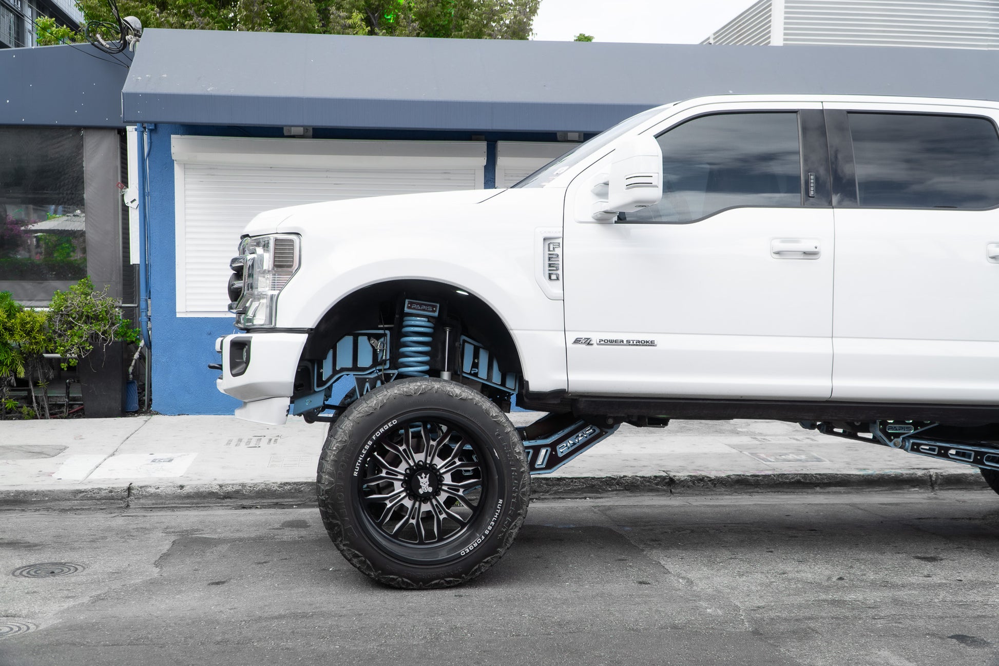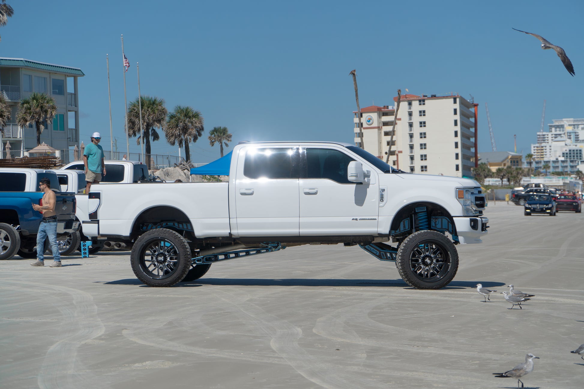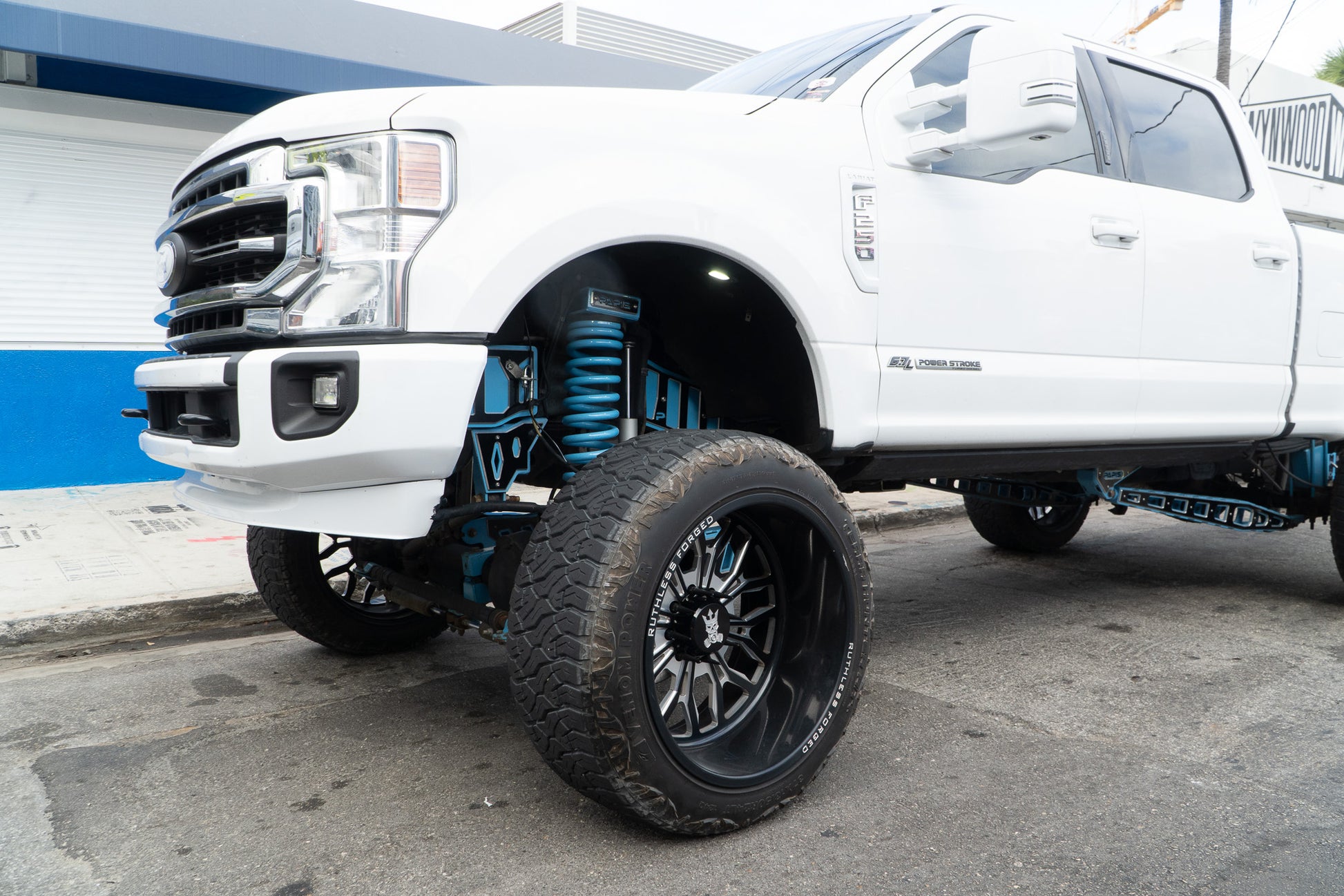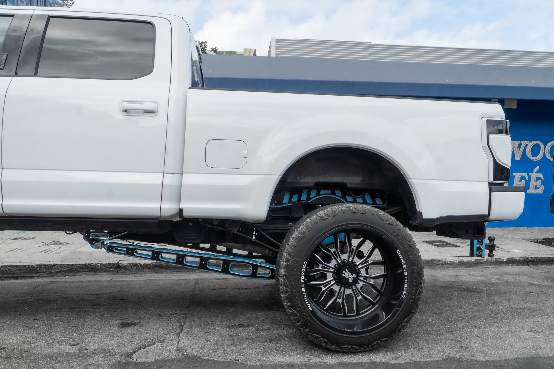This 2017 F250 Super Duty is on our Papis 4.5-10 inch Papis Radius Arm lift kit with traction bars and a steering stabilizer bracket. This truck is using a set of 8 inch springs with our 2.5 level kit on top as well as a set of 10 inch blocks in the rear