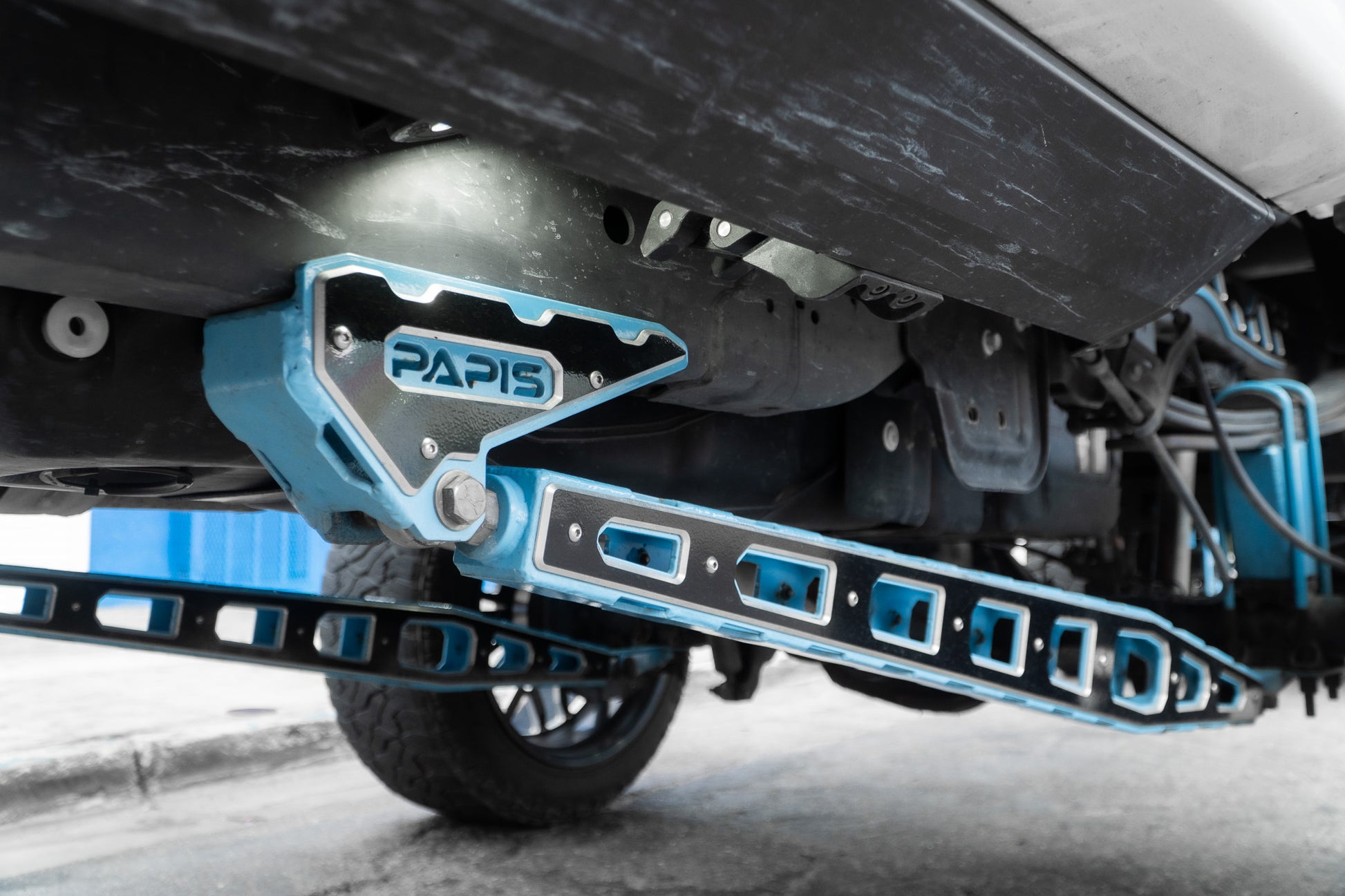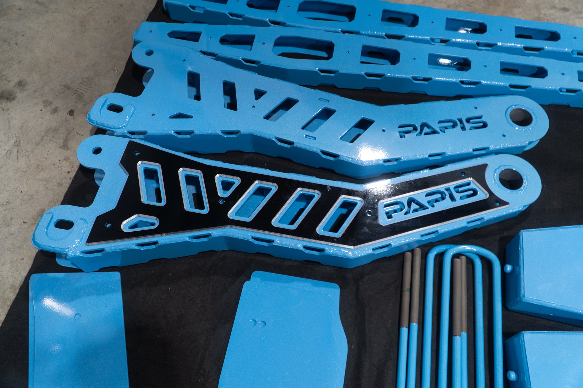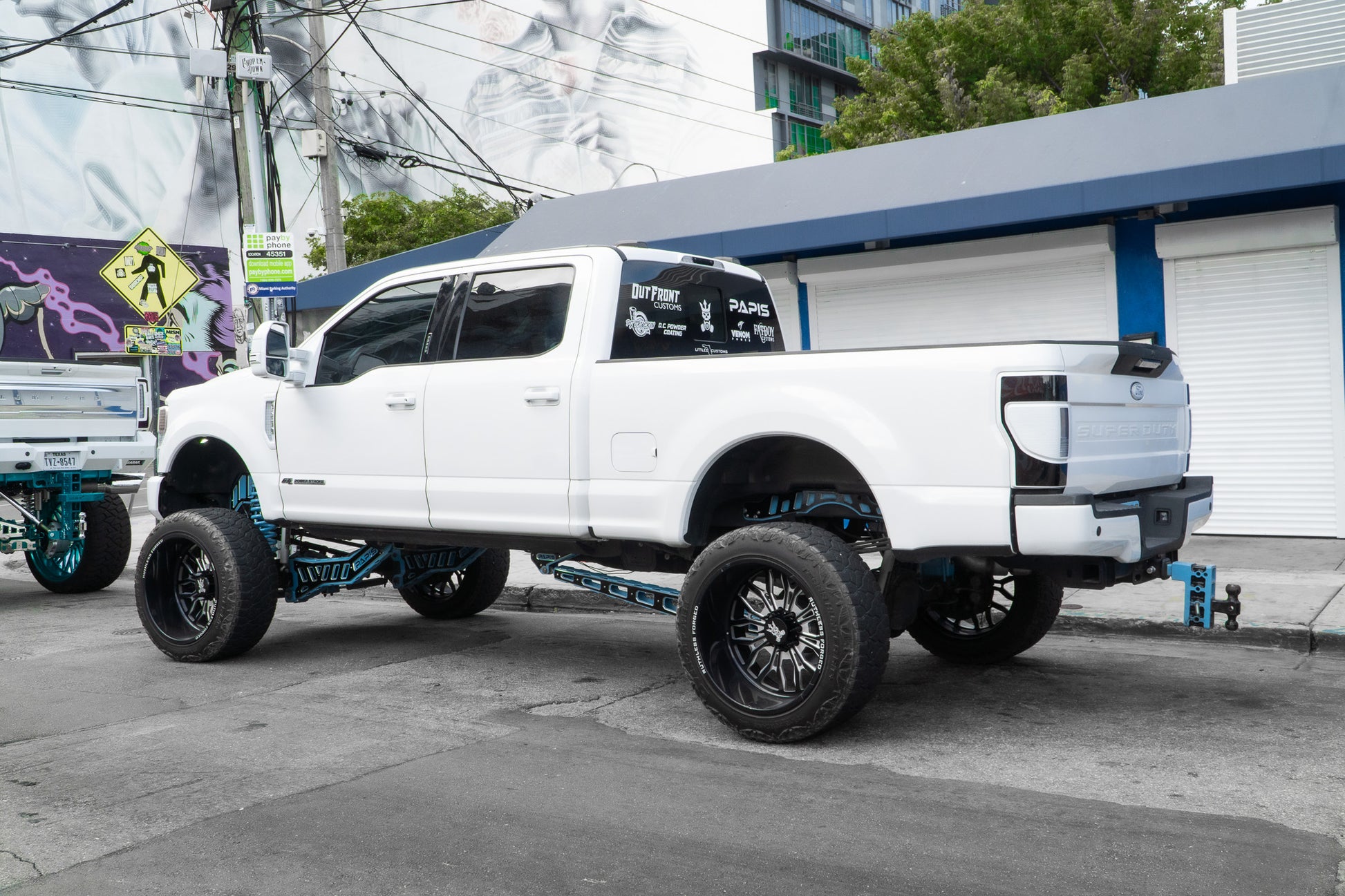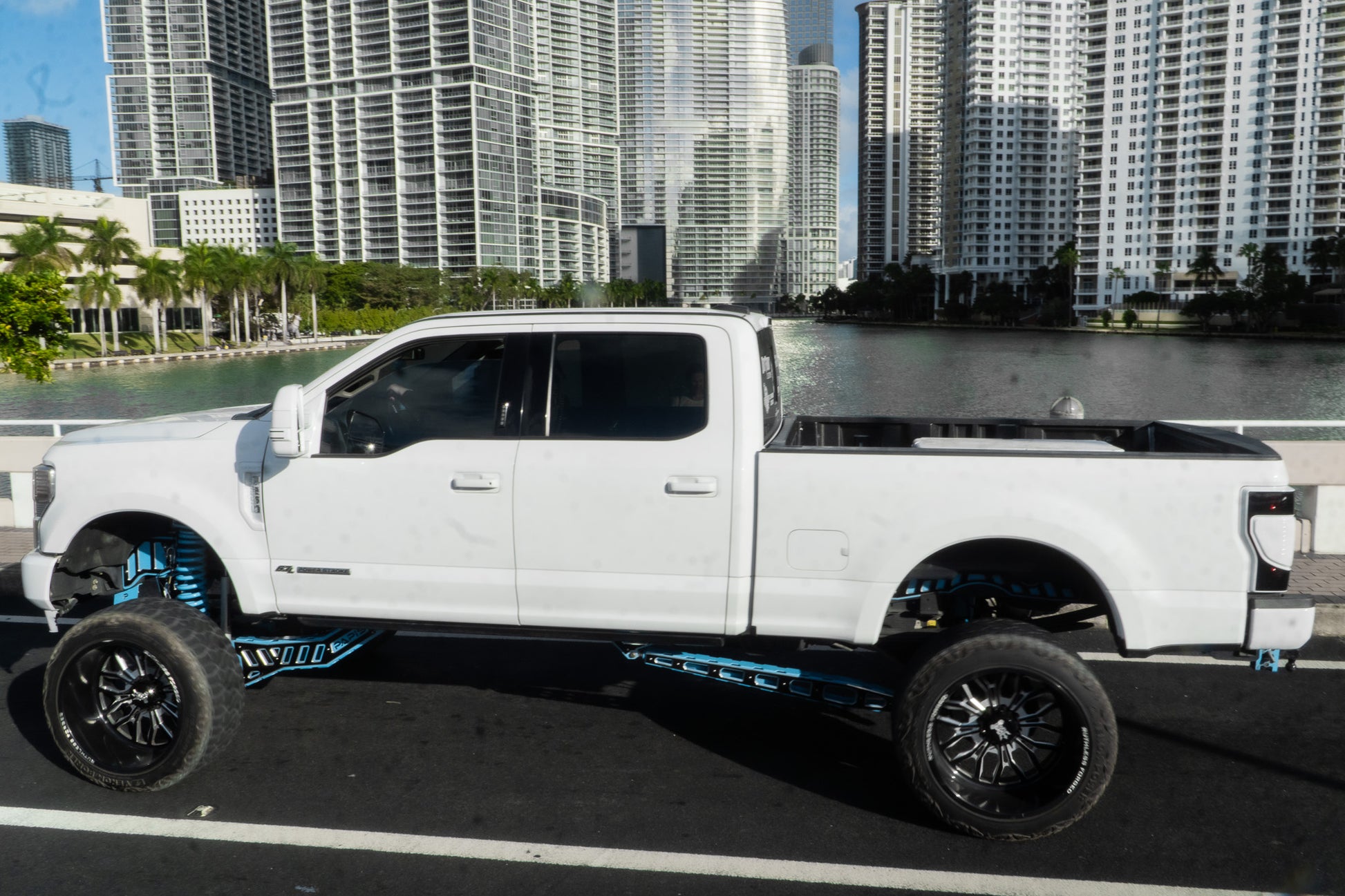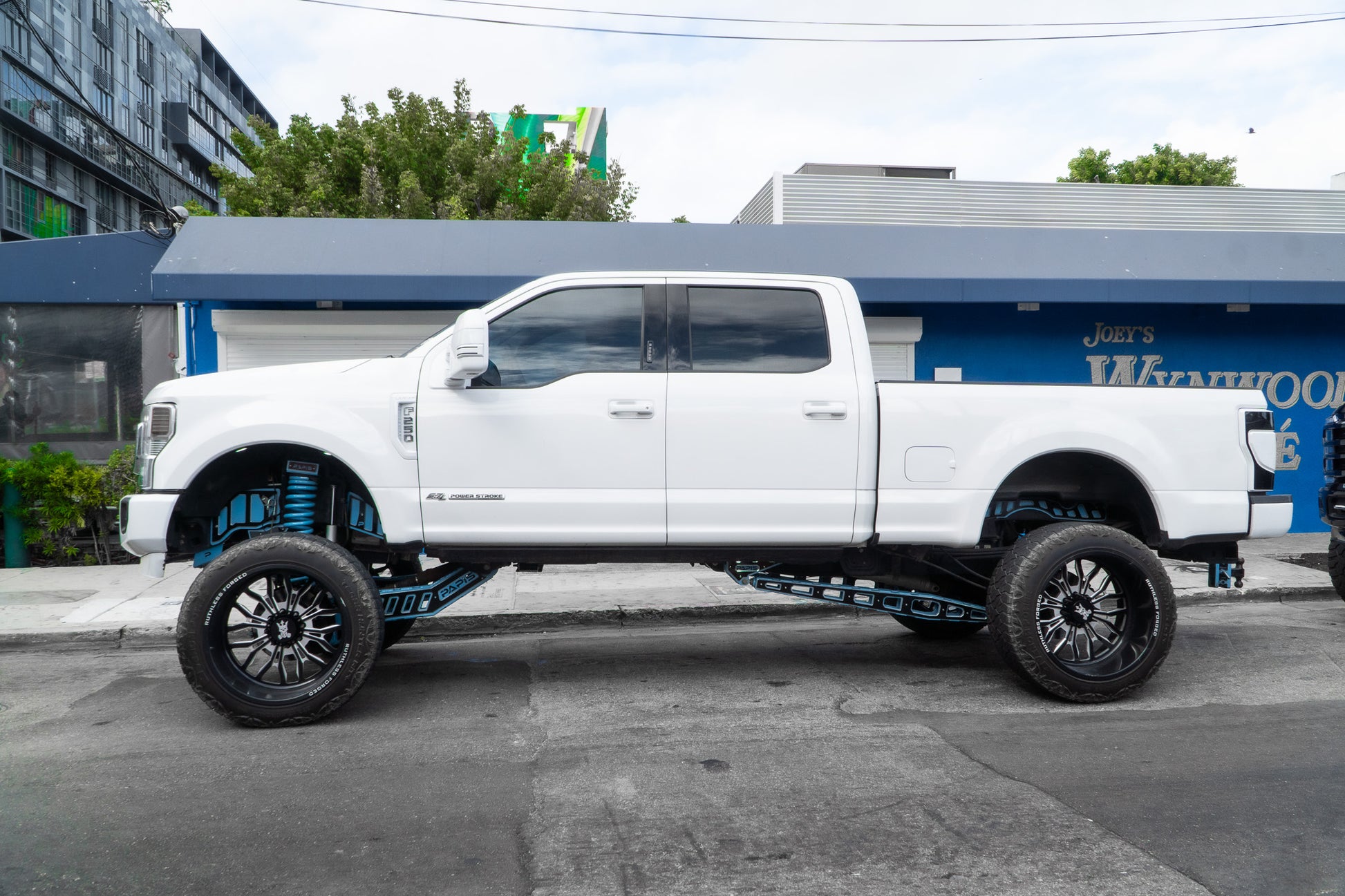 This 2017 F250 Super Duty is on our Papis 4.5-10 inch Papis Radius Arm lift kit with traction bars and a steering stabilizer bracket. This truck is using a set of 8 inch springs with our 2.5 level kit on top as well as a set of 10 inch blocks in the rear