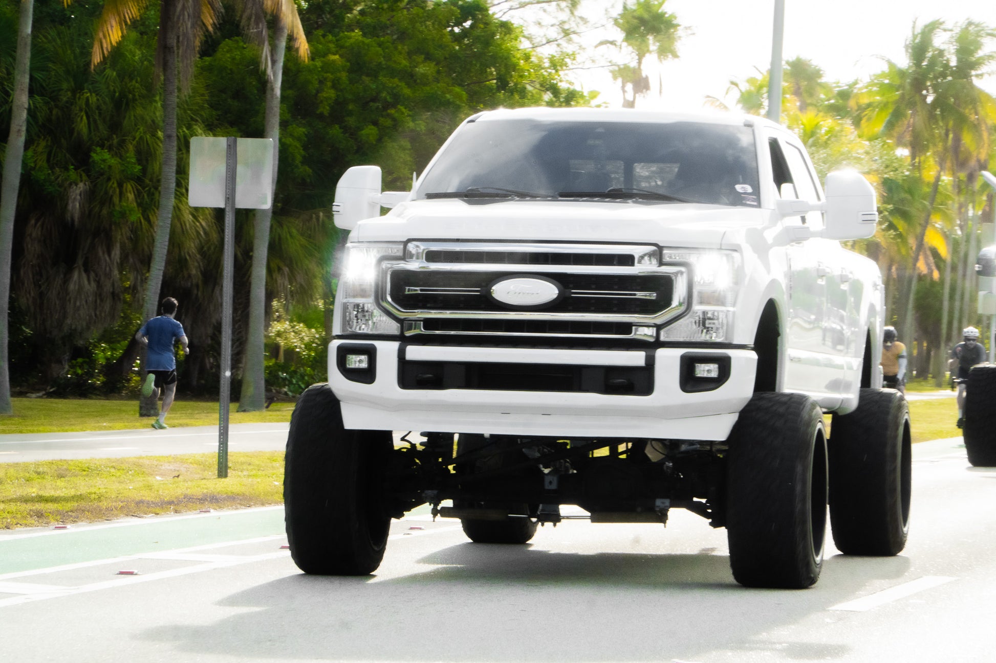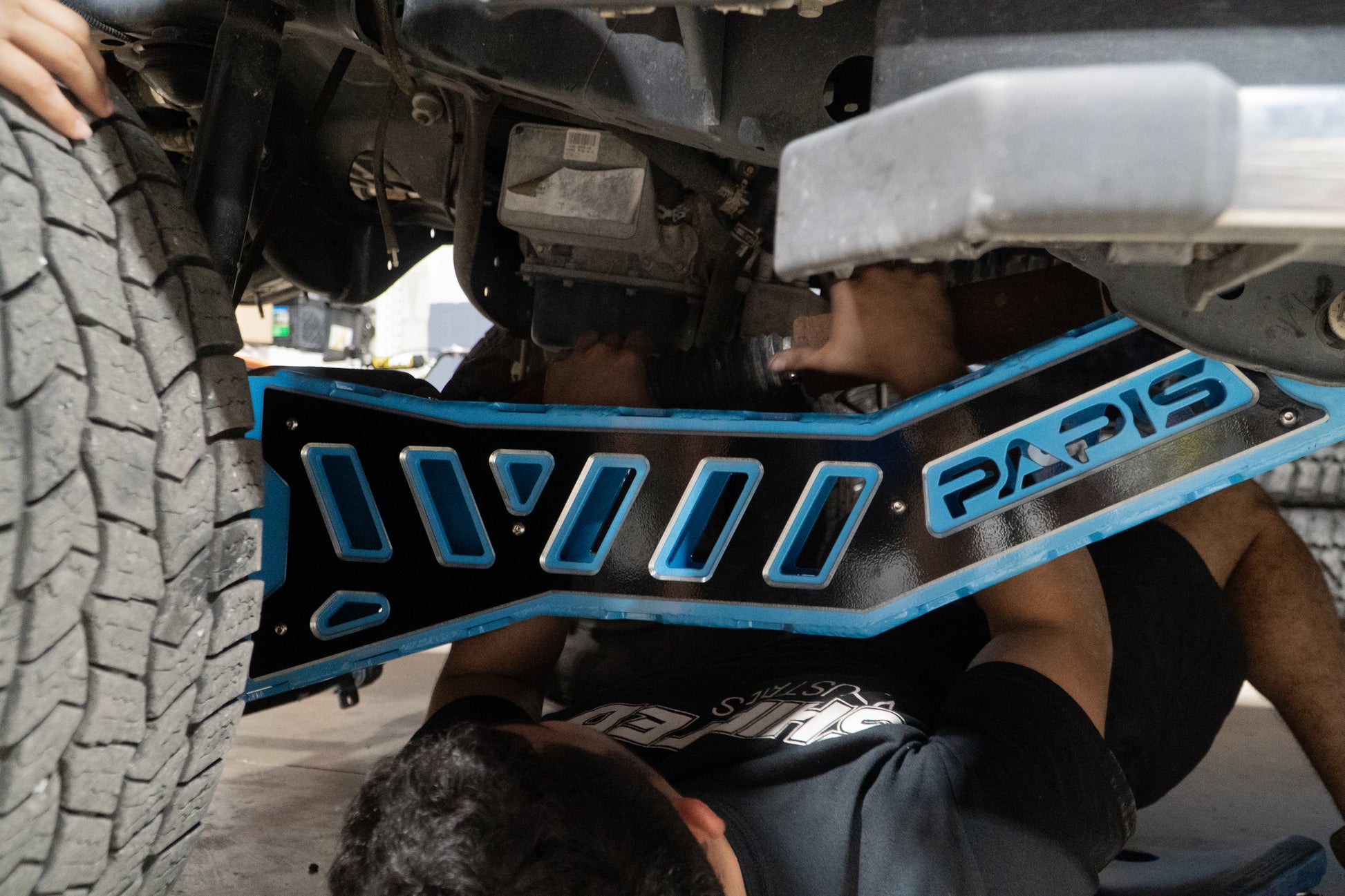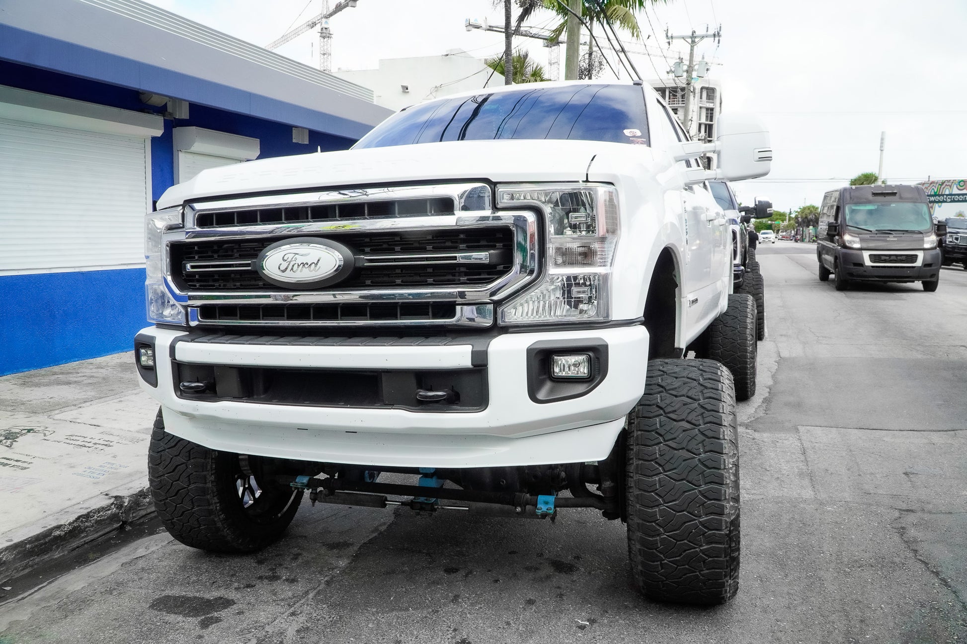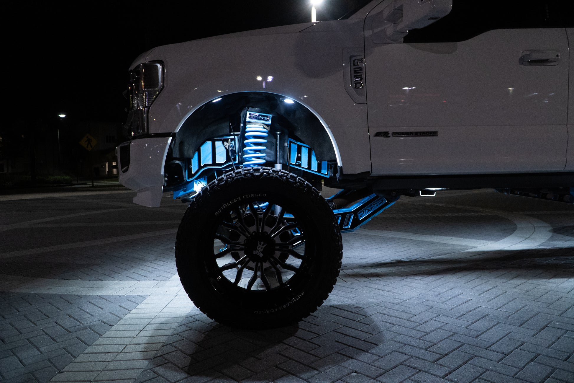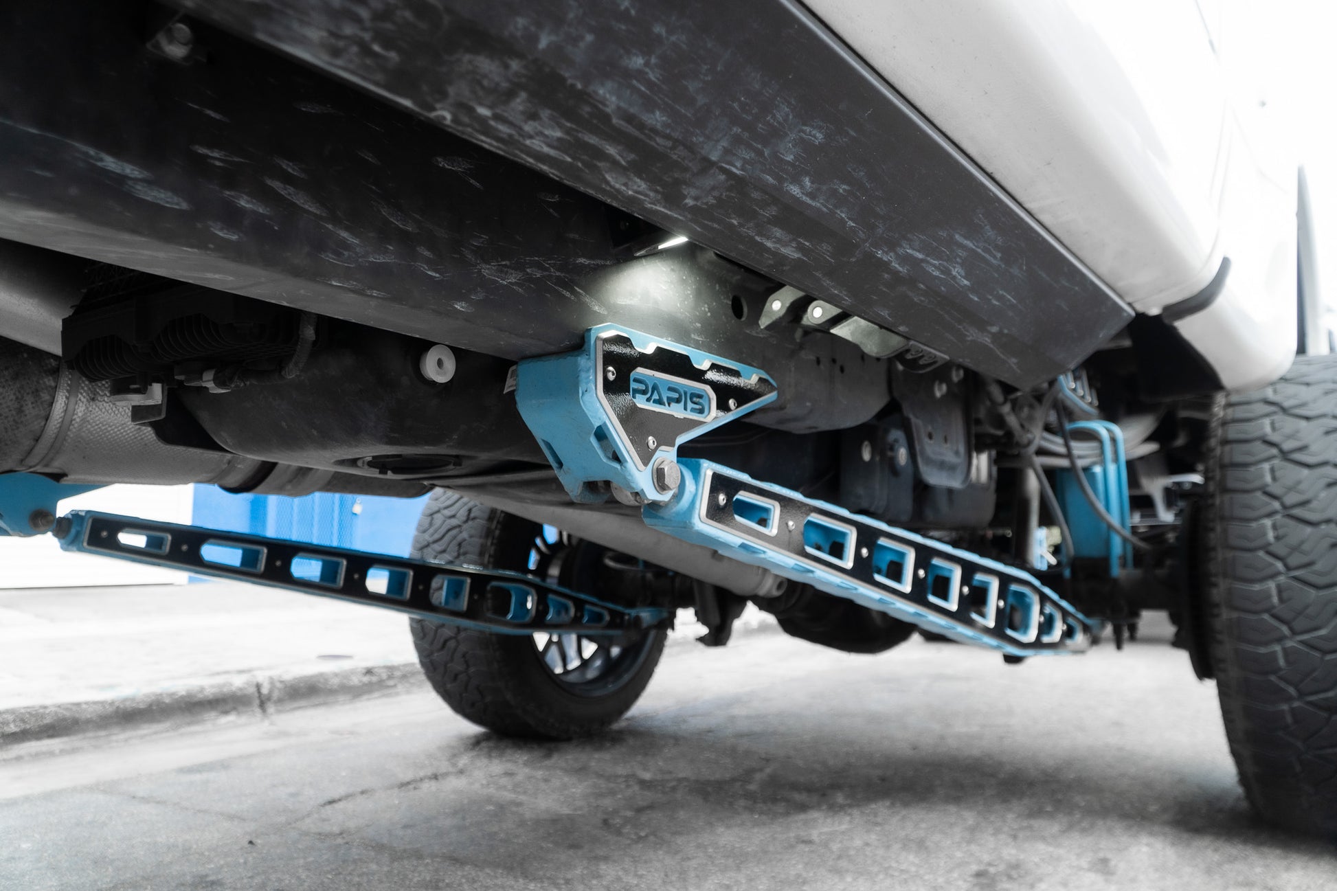 This 2017 F250 Super Duty is on our Papis 4.5-10 inch Papis Radius Arm lift kit with traction bars and a steering stabilizer bracket. This truck is using a set of 8 inch springs with our 2.5 level kit on top as well as a set of 10 inch blocks in the rear
