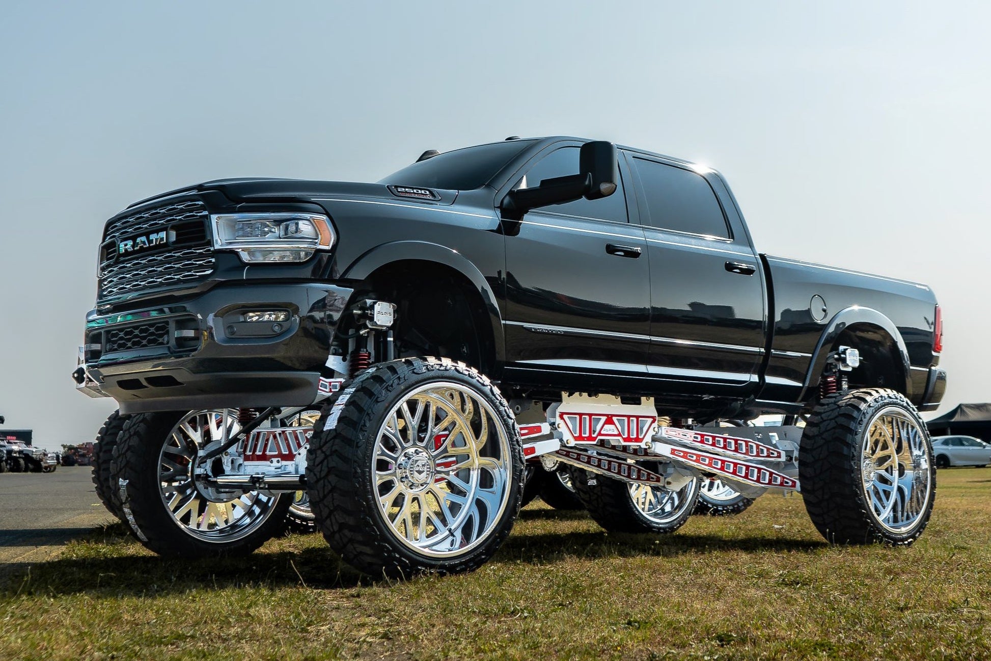 This 2022 Ram 2500 is on our Papis 10-18 inch Long Arm 4 link lift kit with rear 4 link and ccoil over conversion kit and a full High Steer Truss System. This truck is using a set of 16-18 inch Carbon Coil Overs and a rear 3 peice bracketry to run rear Coil Overs as well