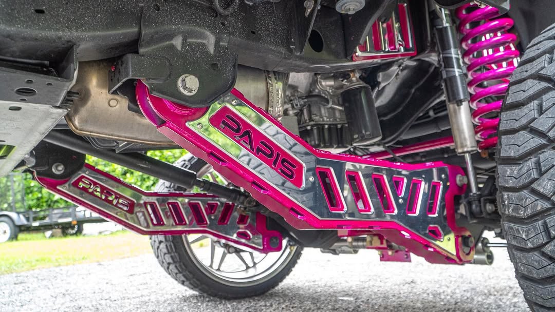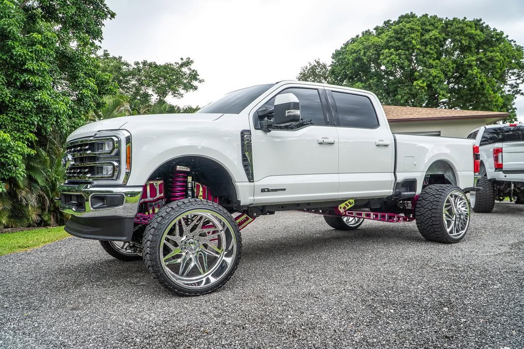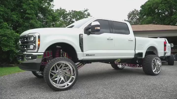 This 2023 F250 Super Duty is on our Papis 4.5-10 inch Papis Radius Arm lift kit with traction bars and a steering stabilizer bracket. This truck is using a set of 8 inch springs with our Papis Coil Plate on top and 8 inch blocks to sit at a true 8 inch