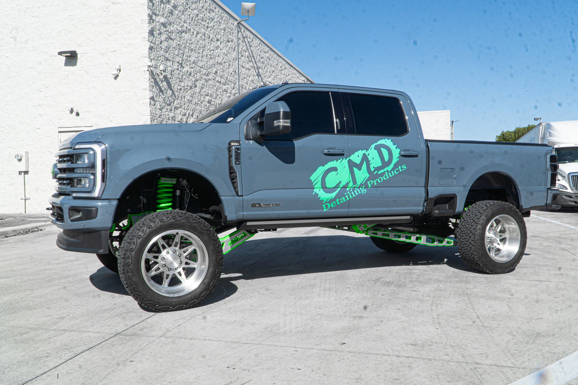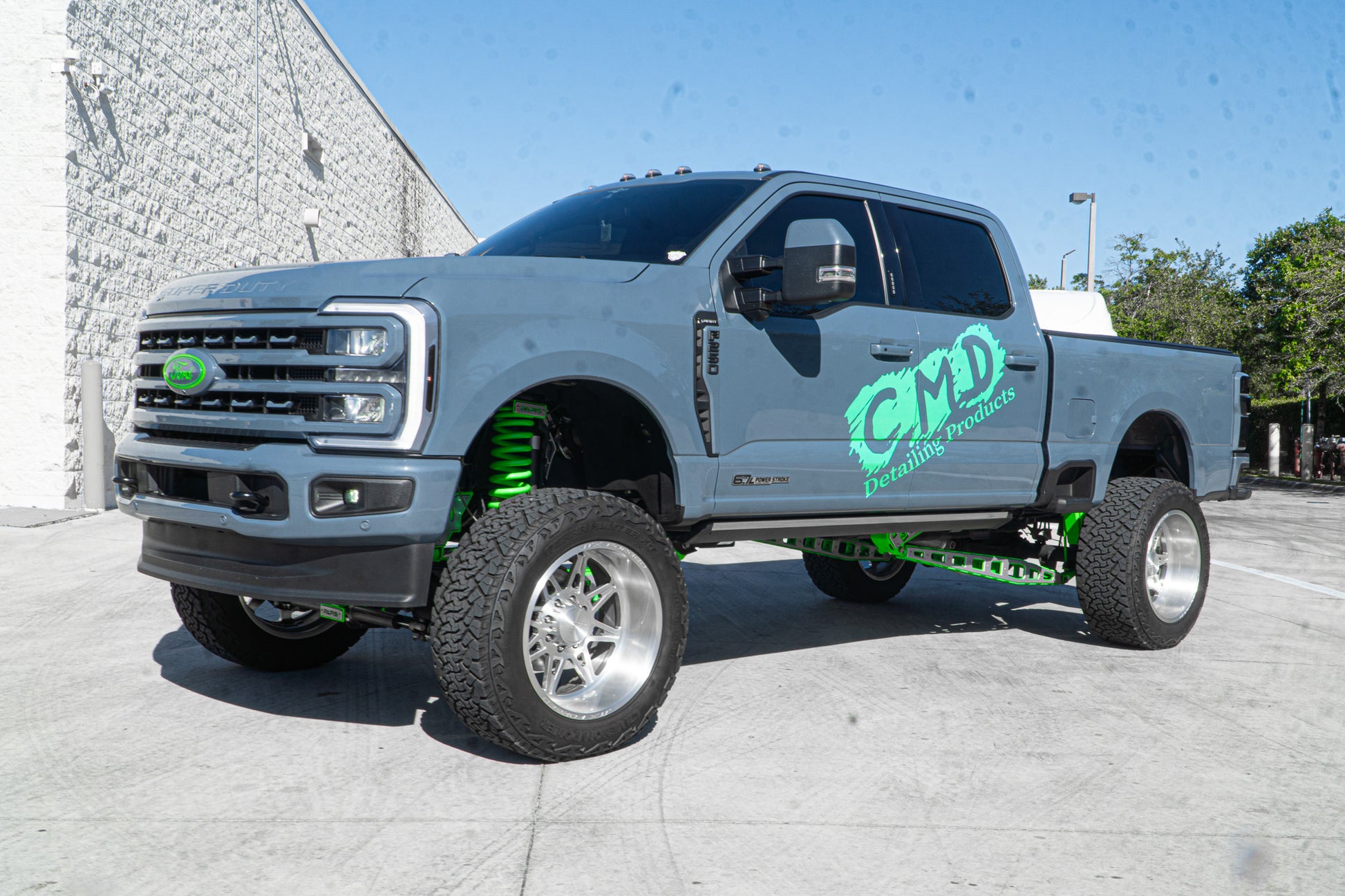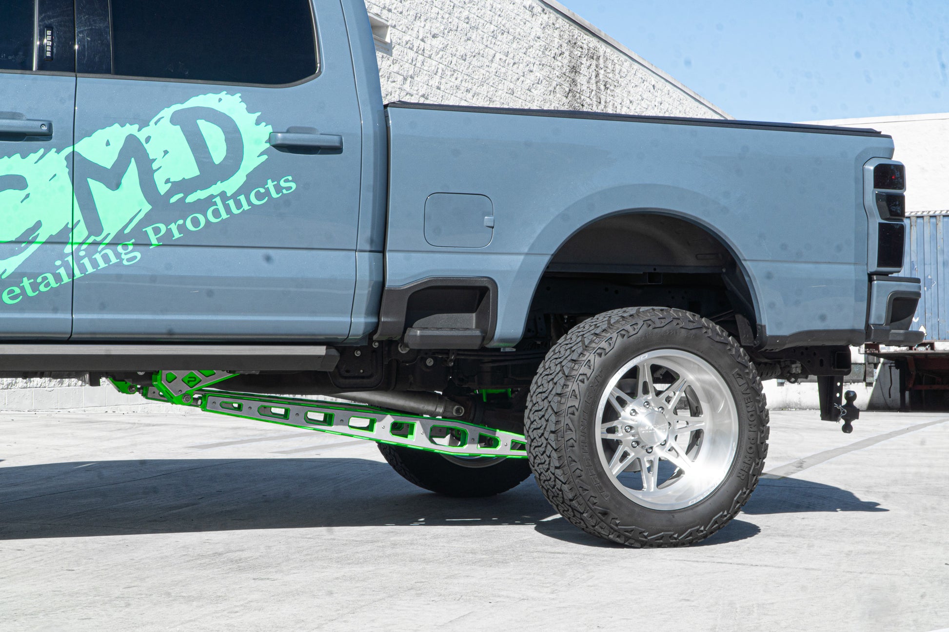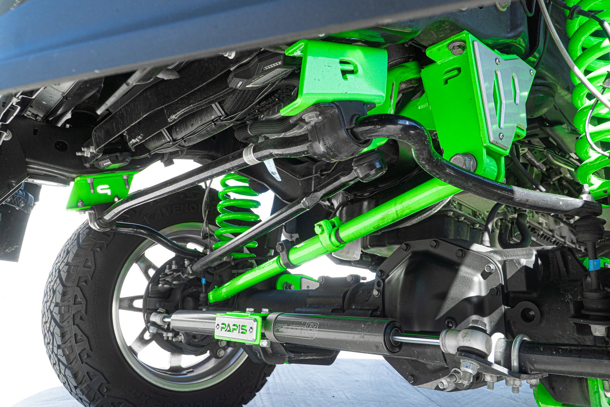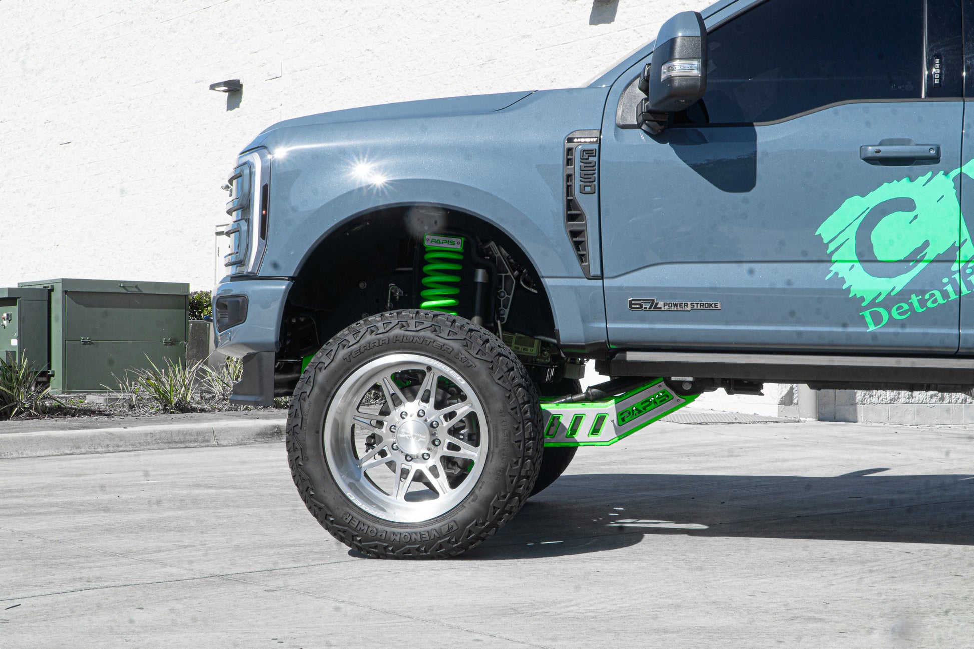 This 2023 F250 Super Duty is on our Papis 4.5-10 inch Papis Radius Arm lift kit with traction bars and a steering stabilizer bracket. This truck is using a set of 8 inch springs with our Papis Coil Plate top