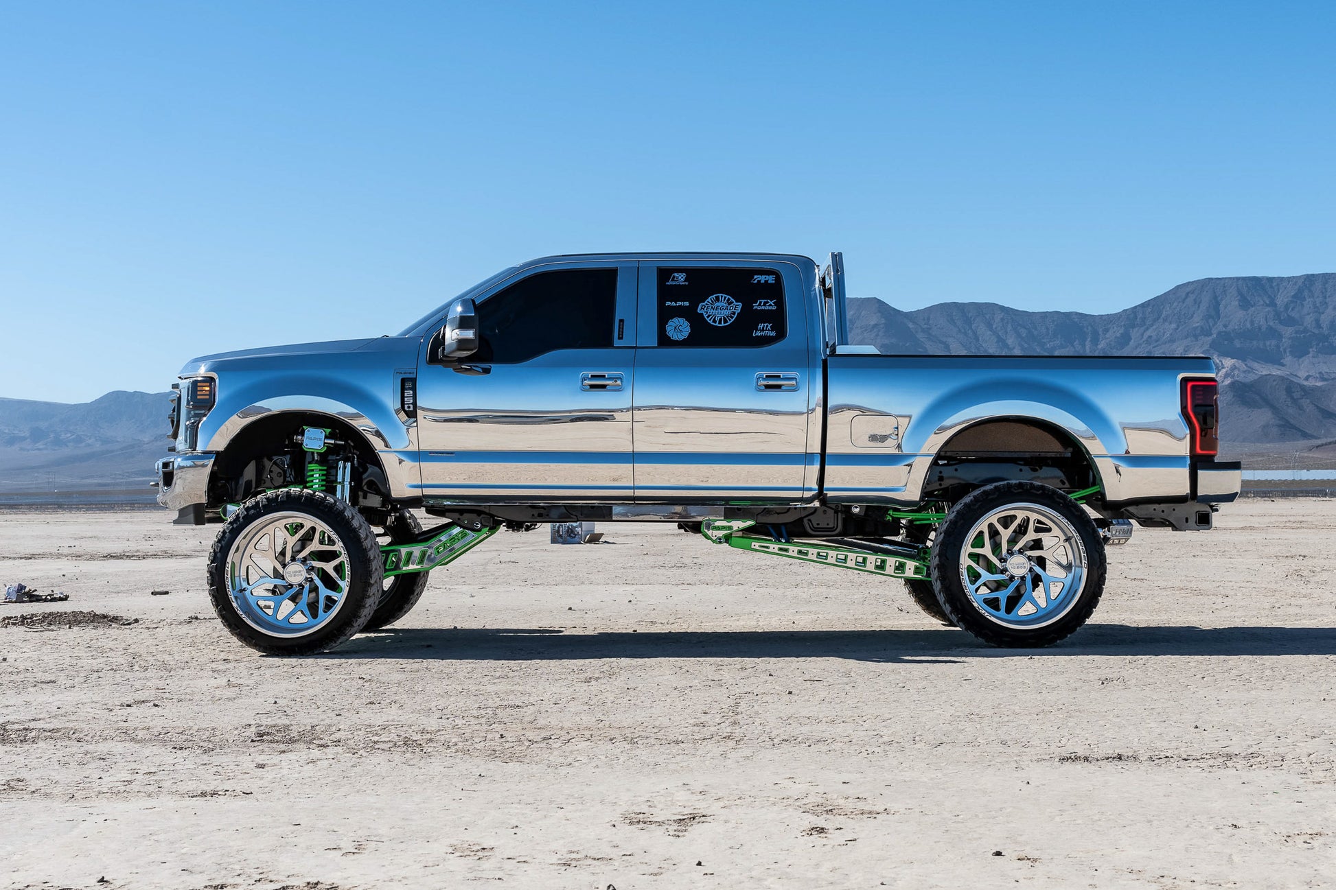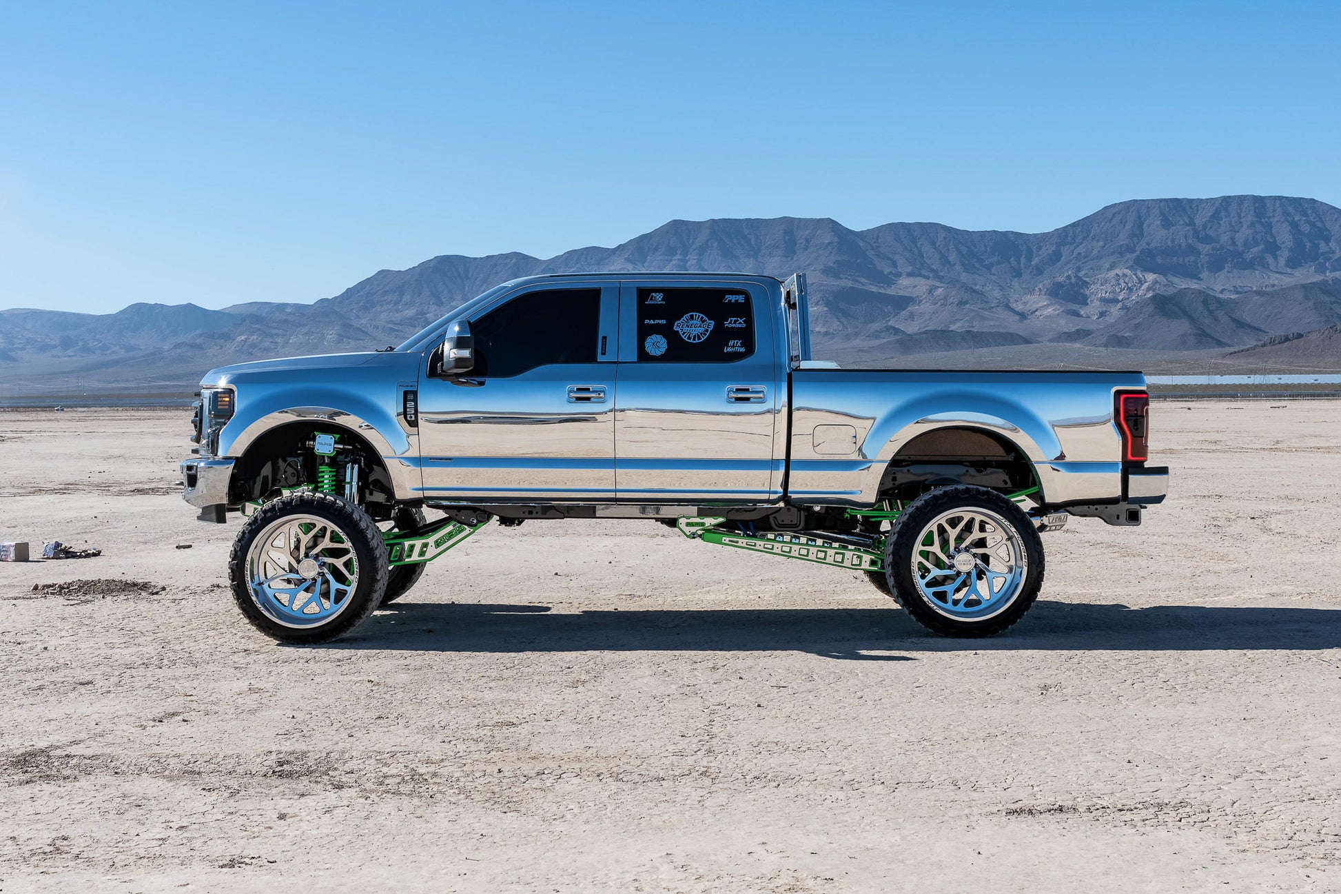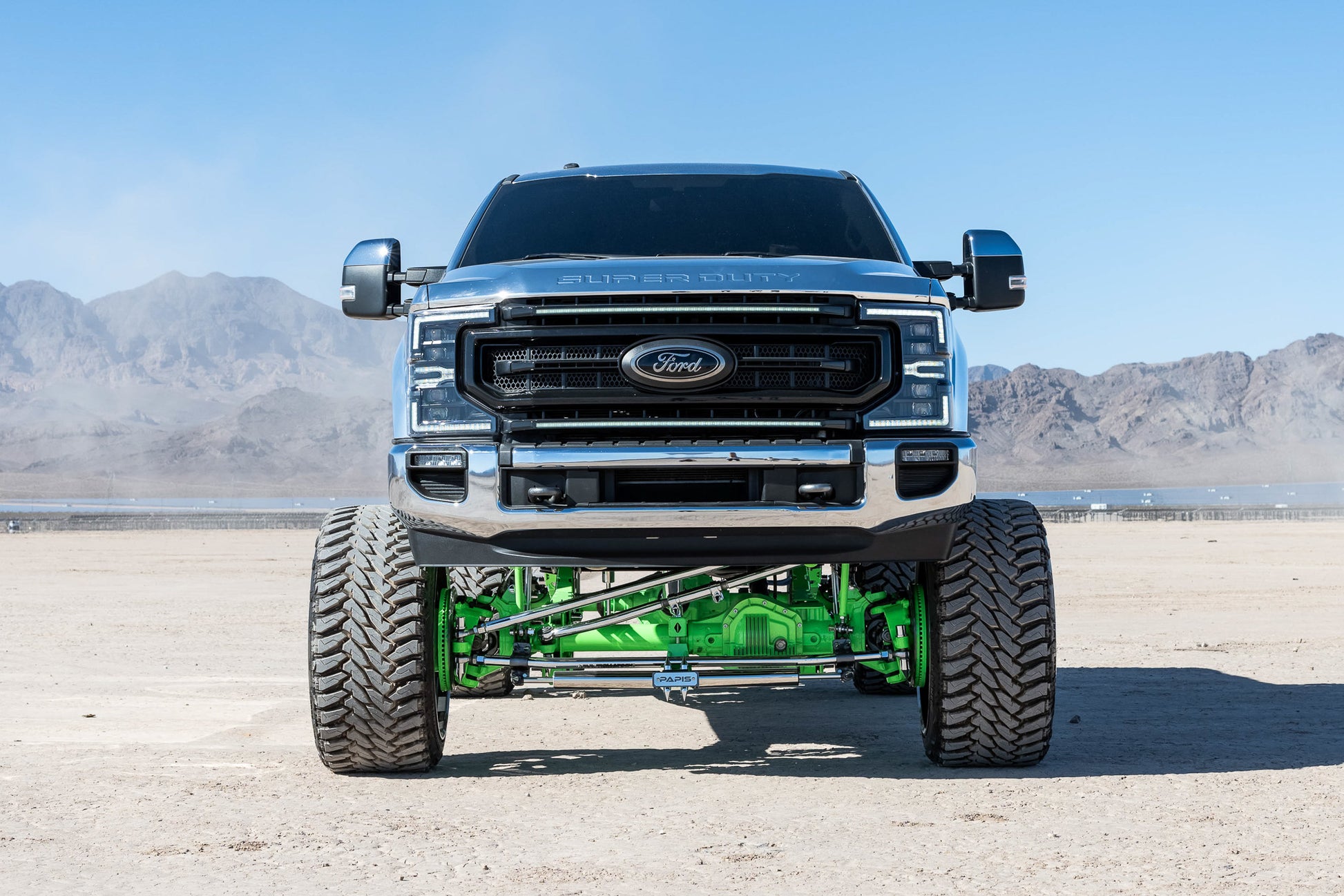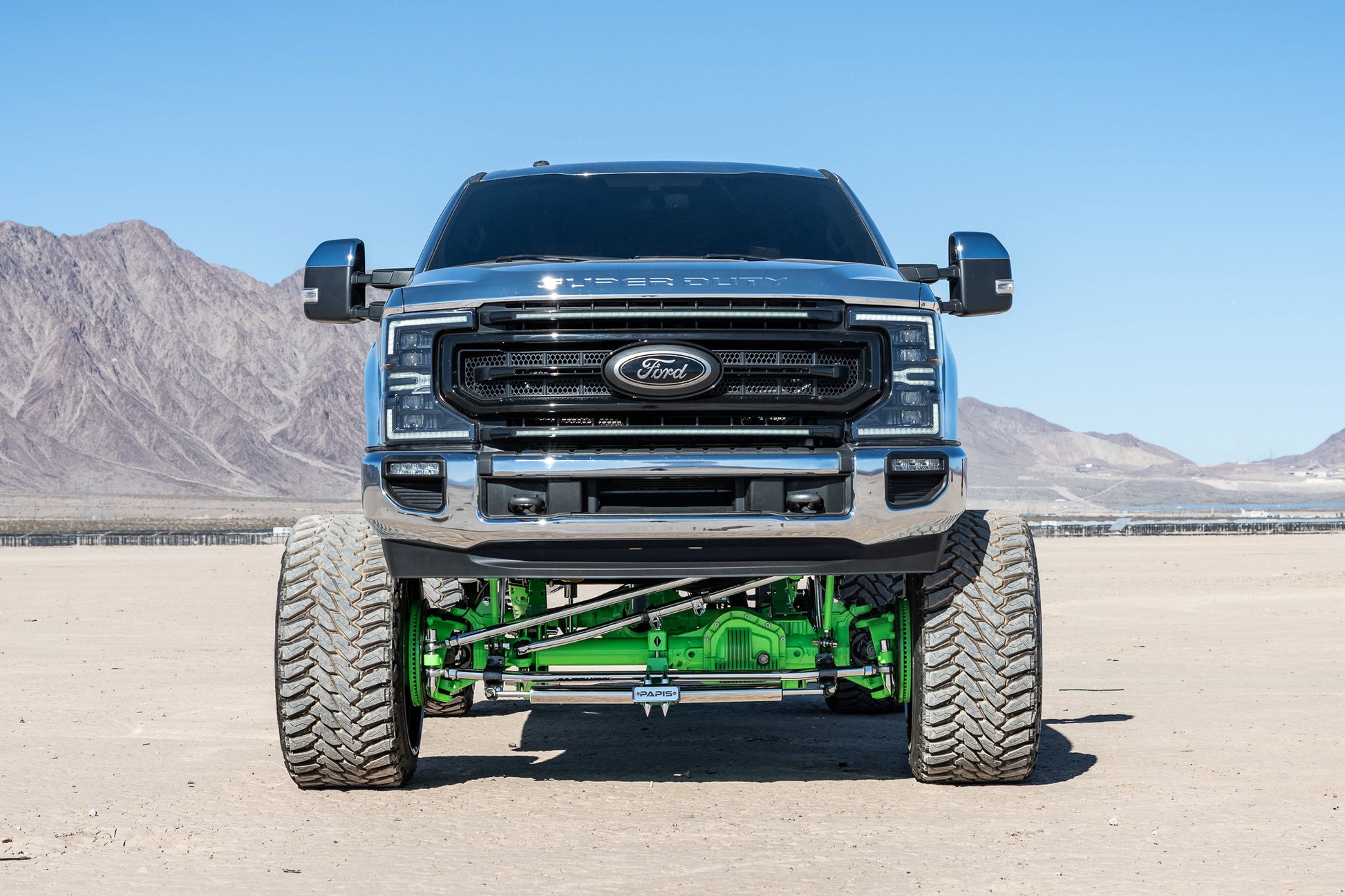 This 2021 F250 Super Duty is on our Papis 4.5-10 inch Papis Radius Arm lift kit with traction bars and a steering stabilizer bracket. This truck is using our Papis Super Duty Coil Over Conversion Bracekts with Coilovers and 8 inch block to retain a perfect 8 inch stance