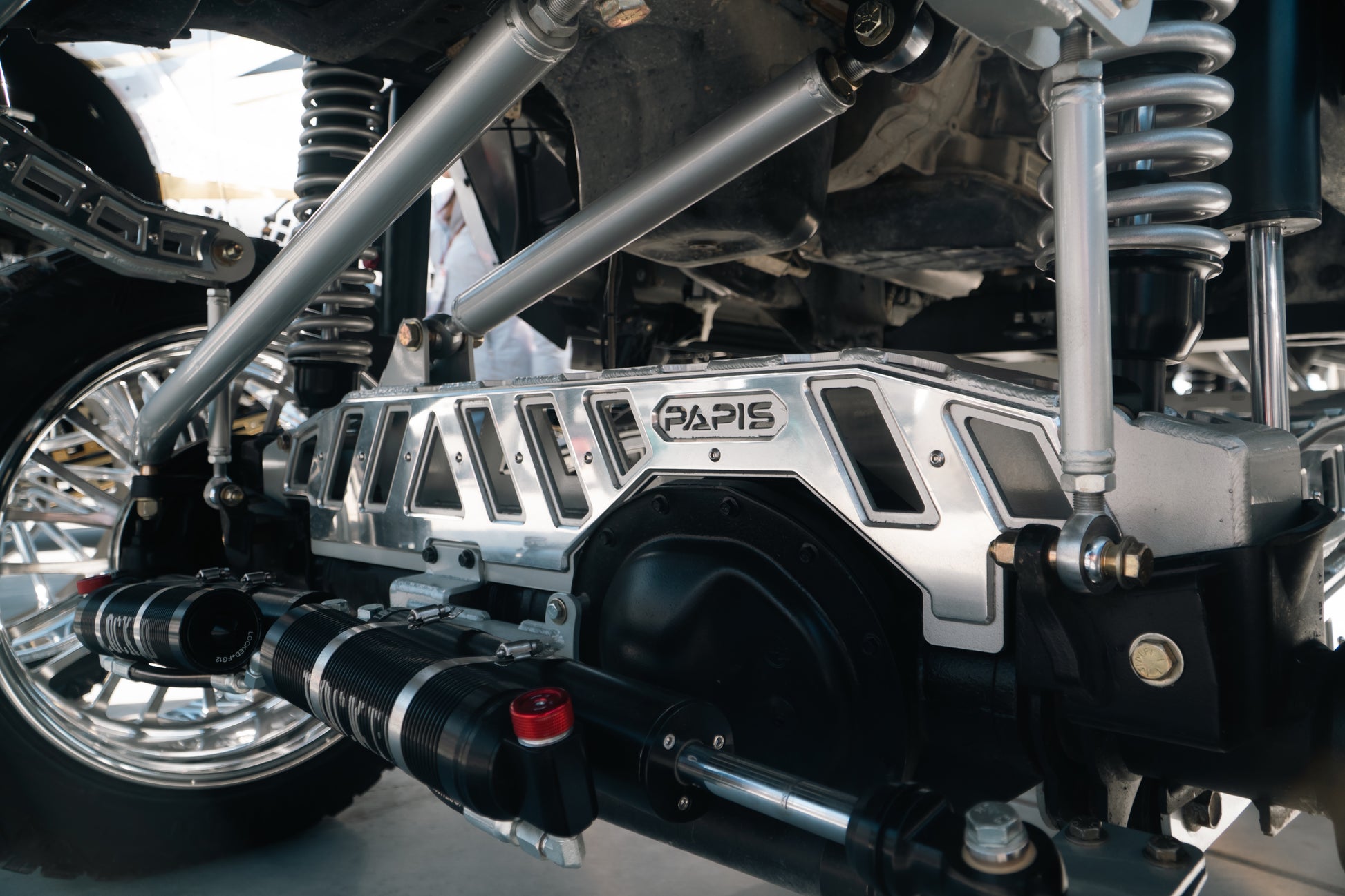 - Track Bar Relocation: Replaces the factory track bar (pan hard bar) with a fully adjustable heim joint track bar for improved alignment and adjustability.